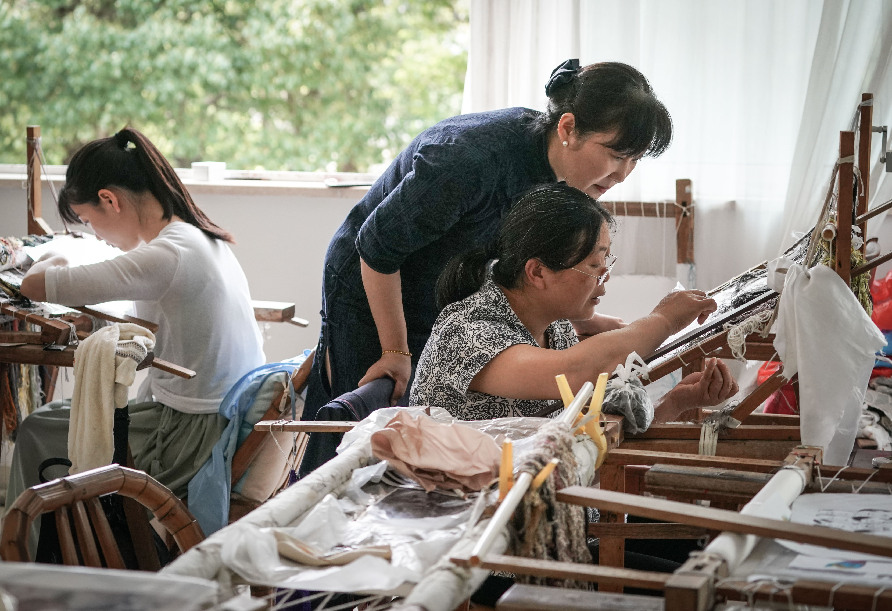 Yao Huifen guides her apprentice at her workshop in Zhenhu Town of Suzhou, east China's Jiangsu Province, June 11, 2019. (Xinhua/Yang Lei)