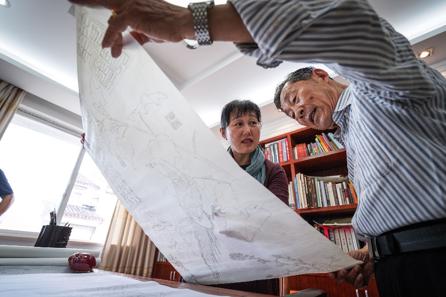 Yao Huifen (L) and her father exchange on a painting at her workshop in Zhenhu Town of Suzhou, east China's Jiangsu Province, May 29, 2019. (Xinhua/Yang Lei)
