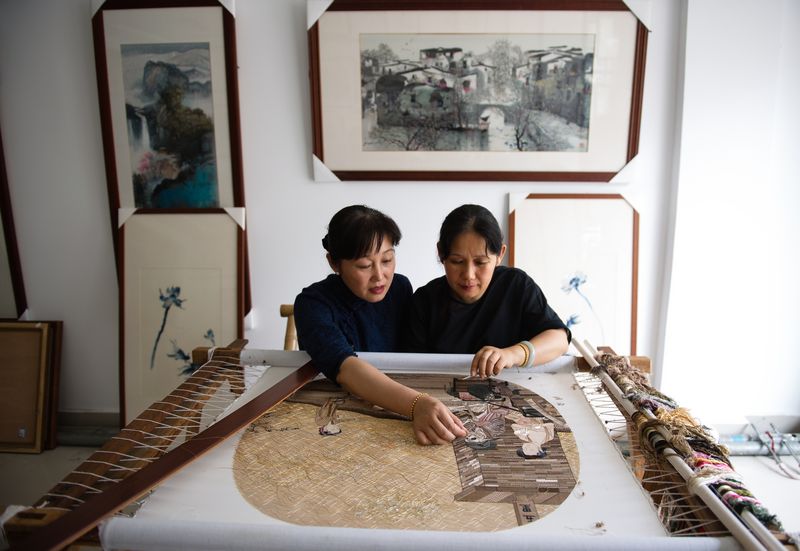 Yao Huifen (L) and her sister Yao Huiqin discuss about stitches at her workshop in Zhenhu Town of Suzhou, east China's Jiangsu Province, June 11, 2019. (Xinhua/Li Xiang)