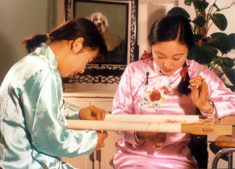 File photo taken in 1994 shows Yao Huifen (R) and her sister Yao Huiqin making embroidery. (Xinhua)