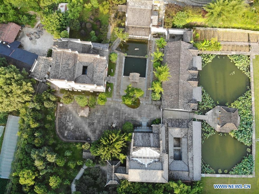 Aerial photo taken on June 27, 2019 shows renovated hotel at Tangcun Village in Wuyuan County, east China's Jiangxi Province. The B&B hotel industry has taken a leap in Wuyuan in recent years. Various measures have been taken to promote local all-for-one tourism, including renovating and decorating hotels and holding cultural activities, so as to improve tourists' experience. As of the end of 2018, Wuyuan County has more than 100 boutique B&B hotels and over 600 public B&B hotels. Wuyuan's B&B hotel business, with a turnover of 1.3 billion yuan (189 million US dollars) in 2018, is gaining momentum in the development of local tourism and rural revitalization. (Xinhua/Sun Ruibo)