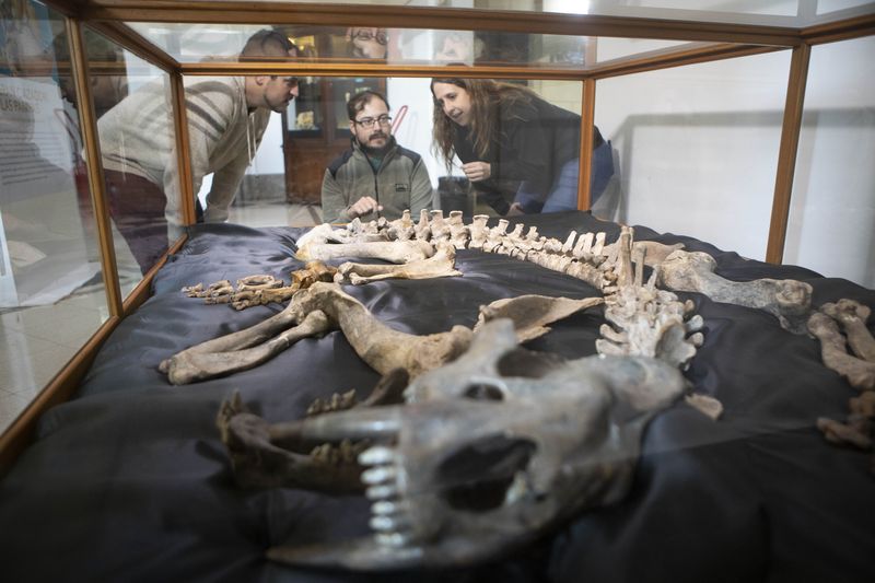 Paleontologists Martin Ezcurra (C), Laura Chornogubsky (R) and Federico Agnolin (L) observe the skeleton of a saber-toothed tiger, or Smilodon, discovered in 1844 by Argentine paleontologist Francisco Javier Muniz, in Argentina's Bernardino Rivadavia Museum of Natural Sciences on August 27, 2019. (Xinhua/Martin Zabala)