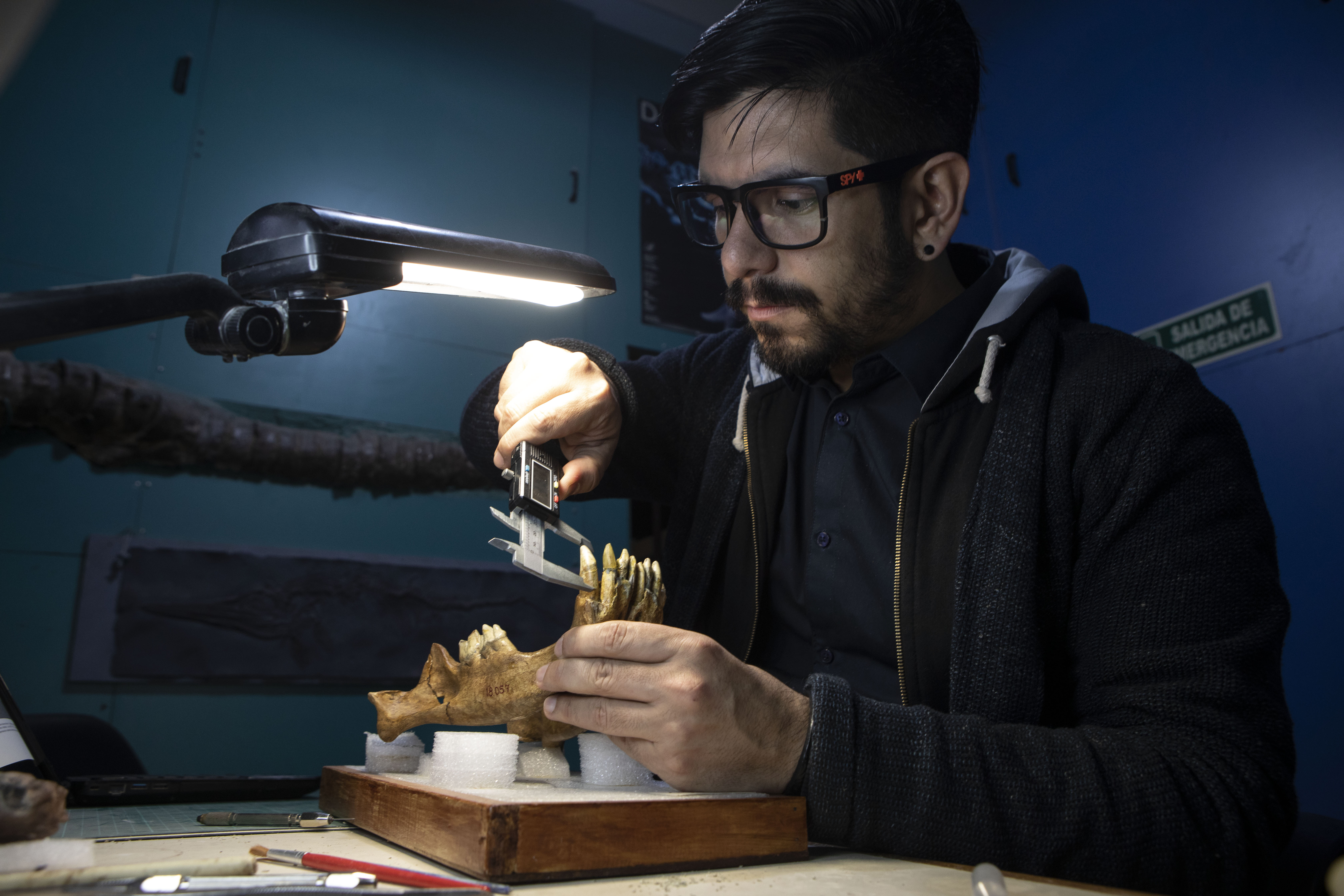 Marcelo Minana, a paleontology technician, was measuring a jaw of a saber-toothed tiger, or Smilodon, in a workshop of Argentina's Bernardino Rivadavia Museum of Natural Science on August 27, 2019. (Xinhua/Martin Zabala)