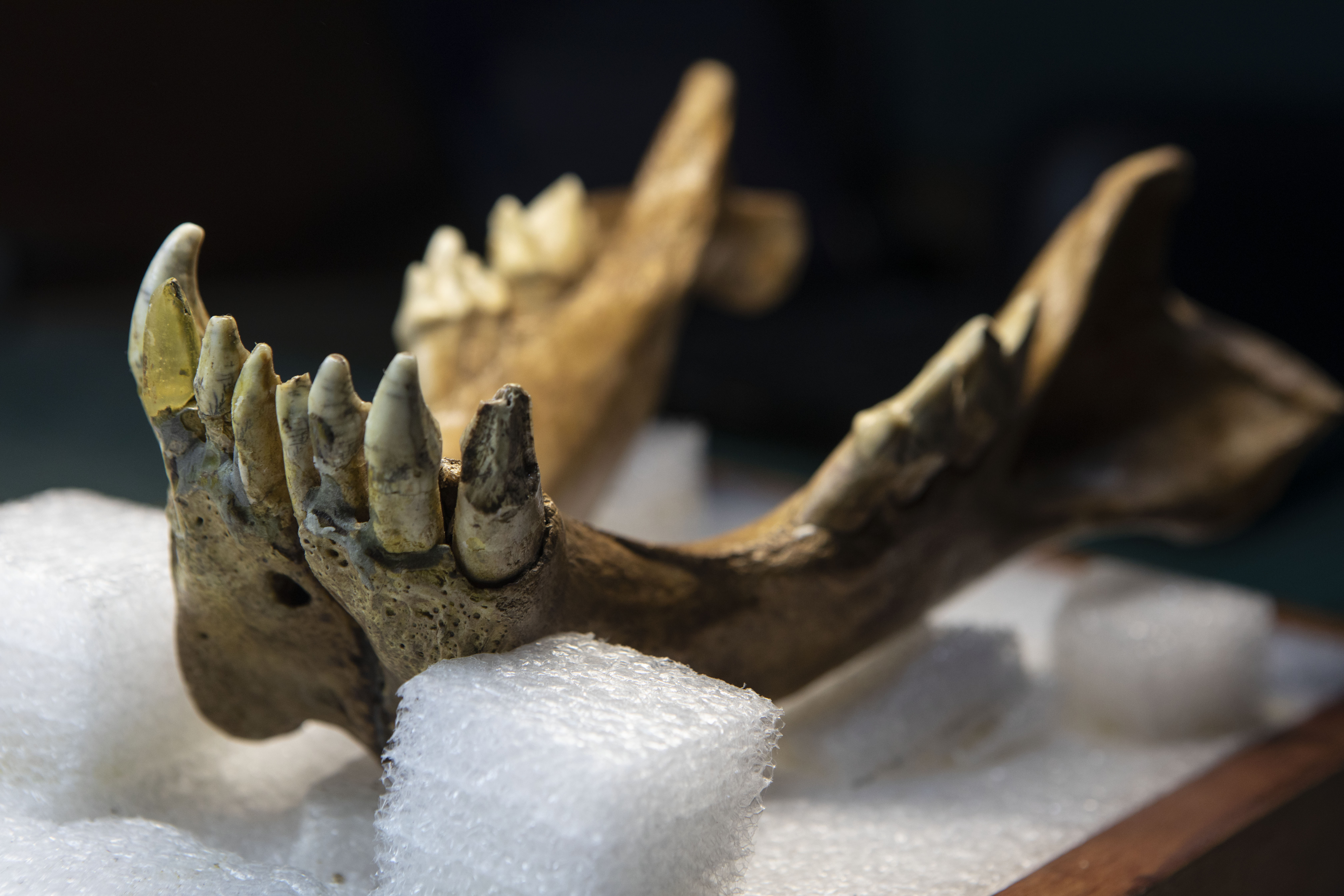 A jaw of a saber-toothed tiger, or Smilodon, is shown in the workshop of the vertebrate paleontology area of Argentina's Bernardino Rivadavia Museum of Natural Science on August 27 of 2019. (Xinhua/Martin Zabala)