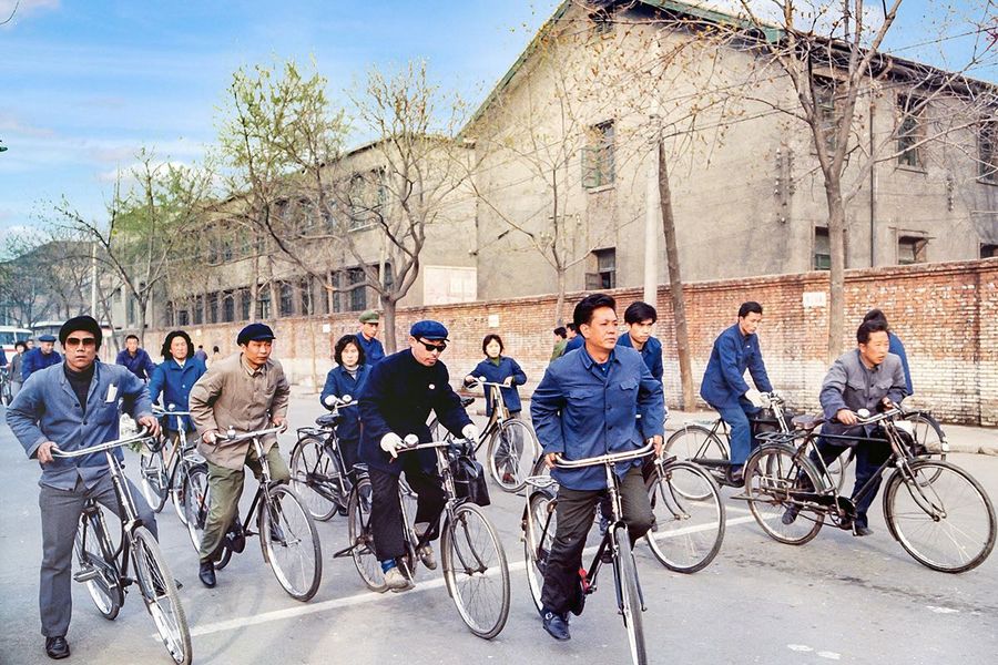 Race time in Shanghai, people are all peddling away either going to work or going home, 1980. (Photo provided to Xinhua by Mike Emery)