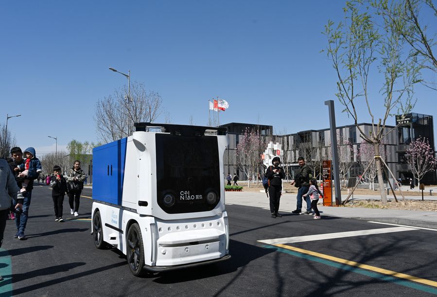 An unmanned express delivery vehicle runs on a street in north China's Hebei Province, on March 31, 2019. The new energy vehicle can convey about 200 small packages at one time from delivery station to intelligent cabinet. (Xinhua/Jin Liangkuai)