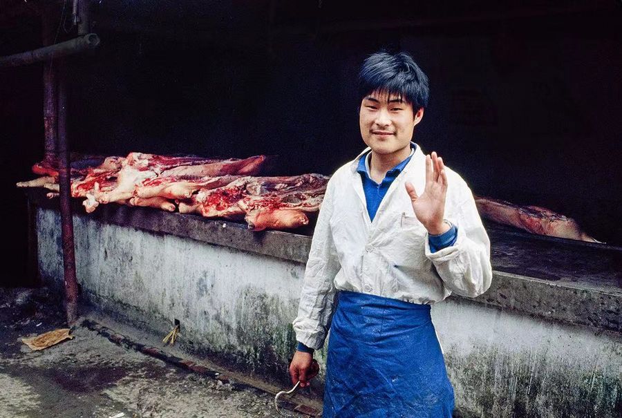 A butcher is waving to the camera in China, 1980. (Photo provided to Xinhua by Mike Emery)
