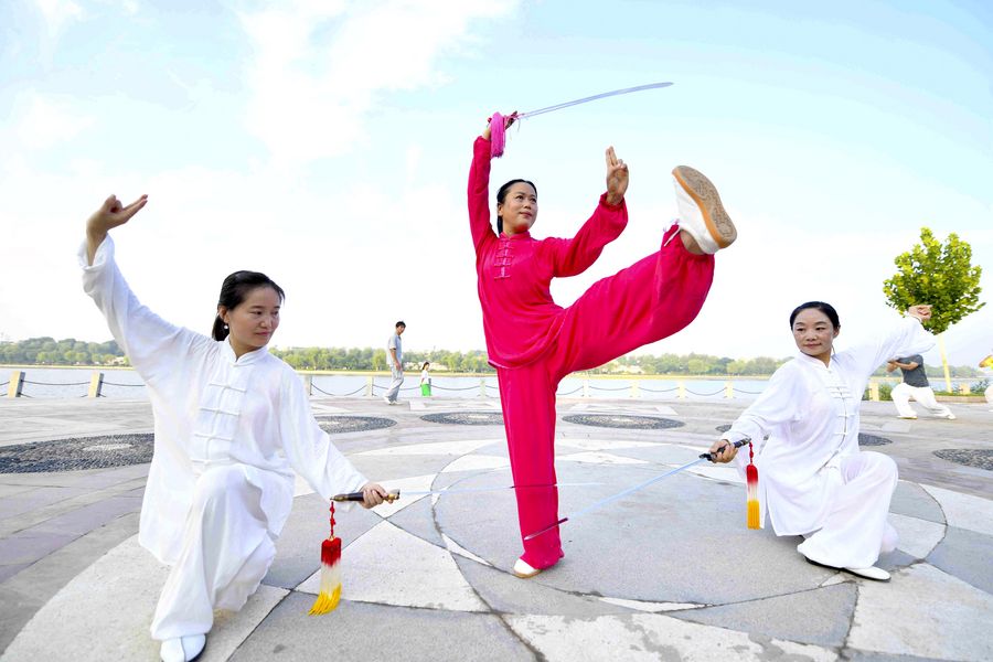 Citizens do morning exercises at the Wohe Park in Bozhou, east China's Anhui Province, Aug. 3, 2018. (Xinhua/Liu Qinli)