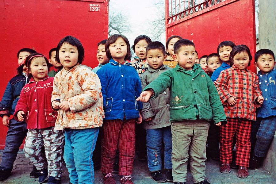 Children at a preschool on the outskirts of Beijing. Boy and girls wore colorful jackets and padded trousers to keep the cold out, 1980. (Photo provided to Xinhua by Mike Emery)