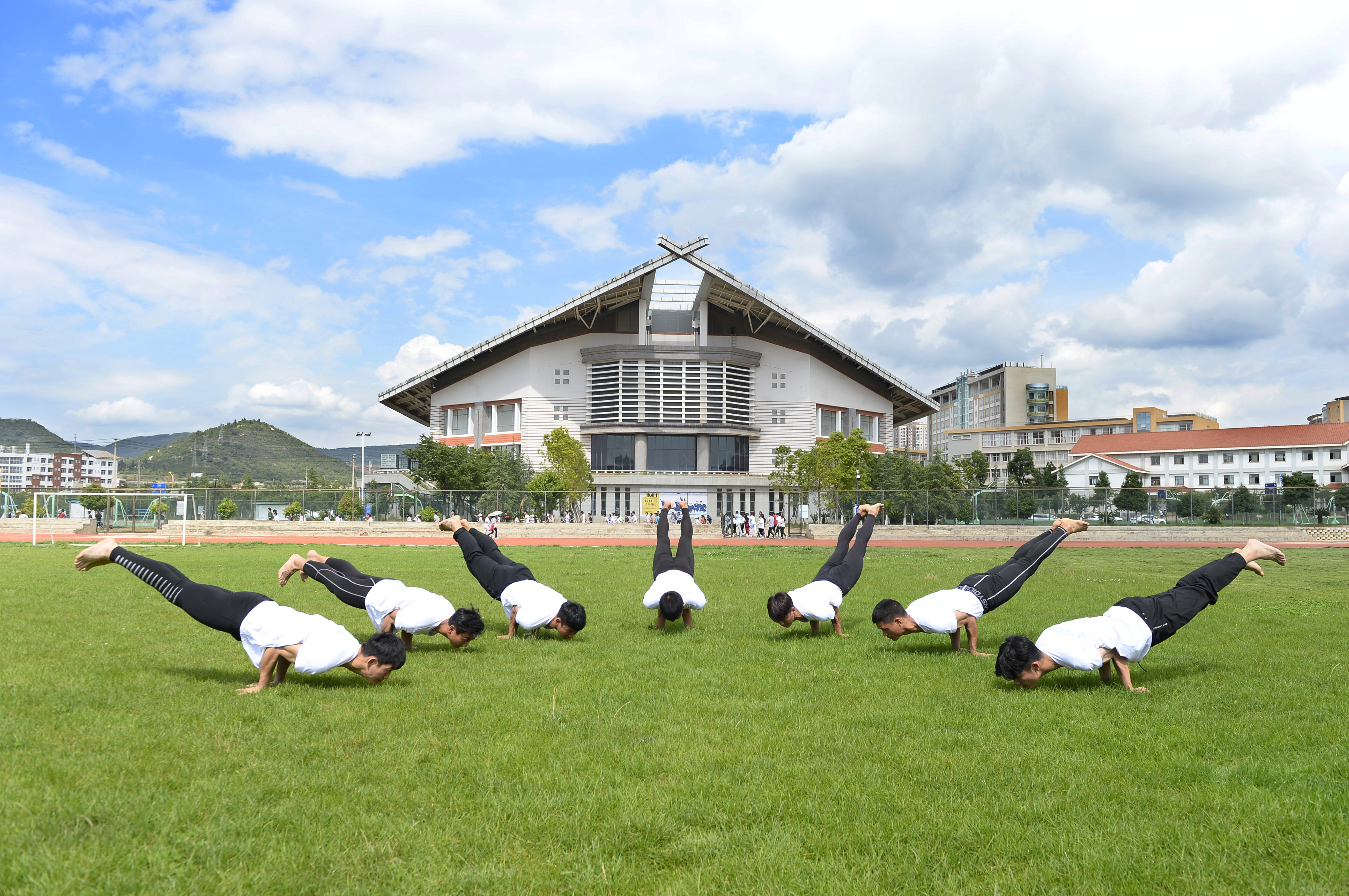 Students from the China-India Yoga College (International Taichi College) of Yunnan Minzu University perform yoga on campus. (Yunnan Minzu University)