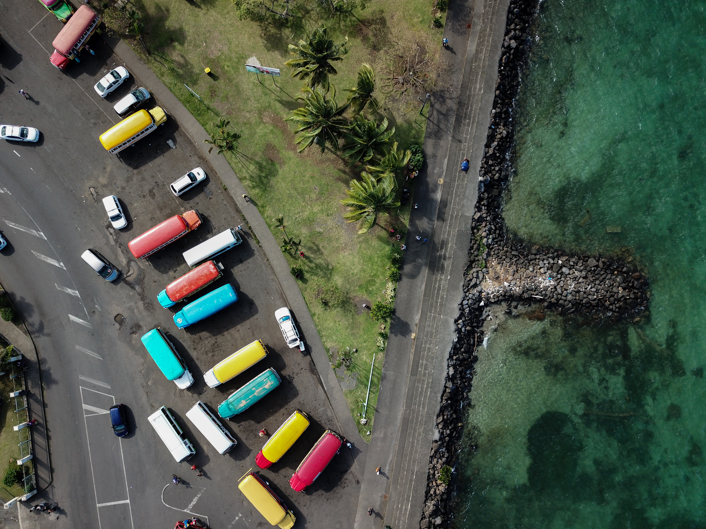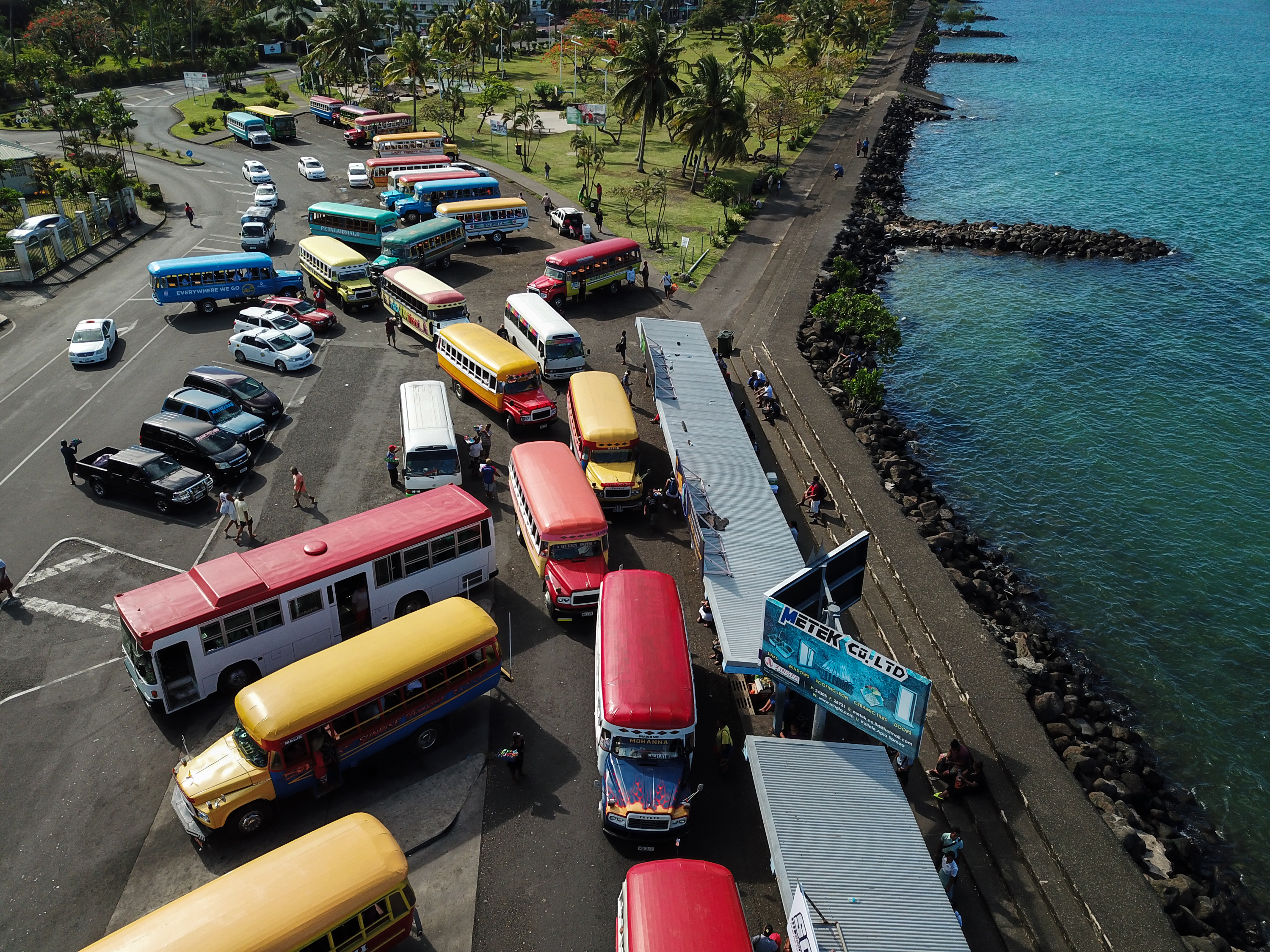 Aerial photo taken on Oct. 22, 2019 shows public buses at the main bus station of Apia, capital of Samoa. (Xinhua/Guo Lei)
