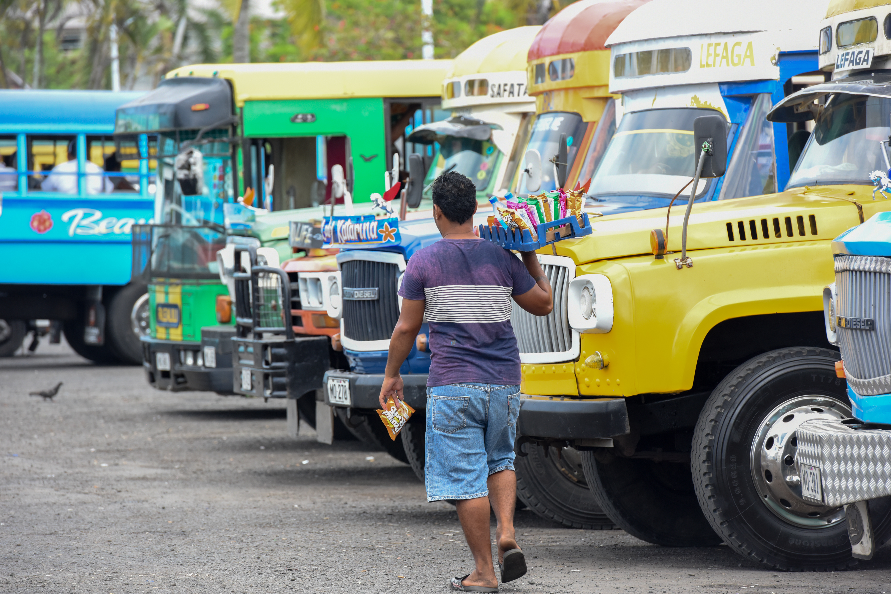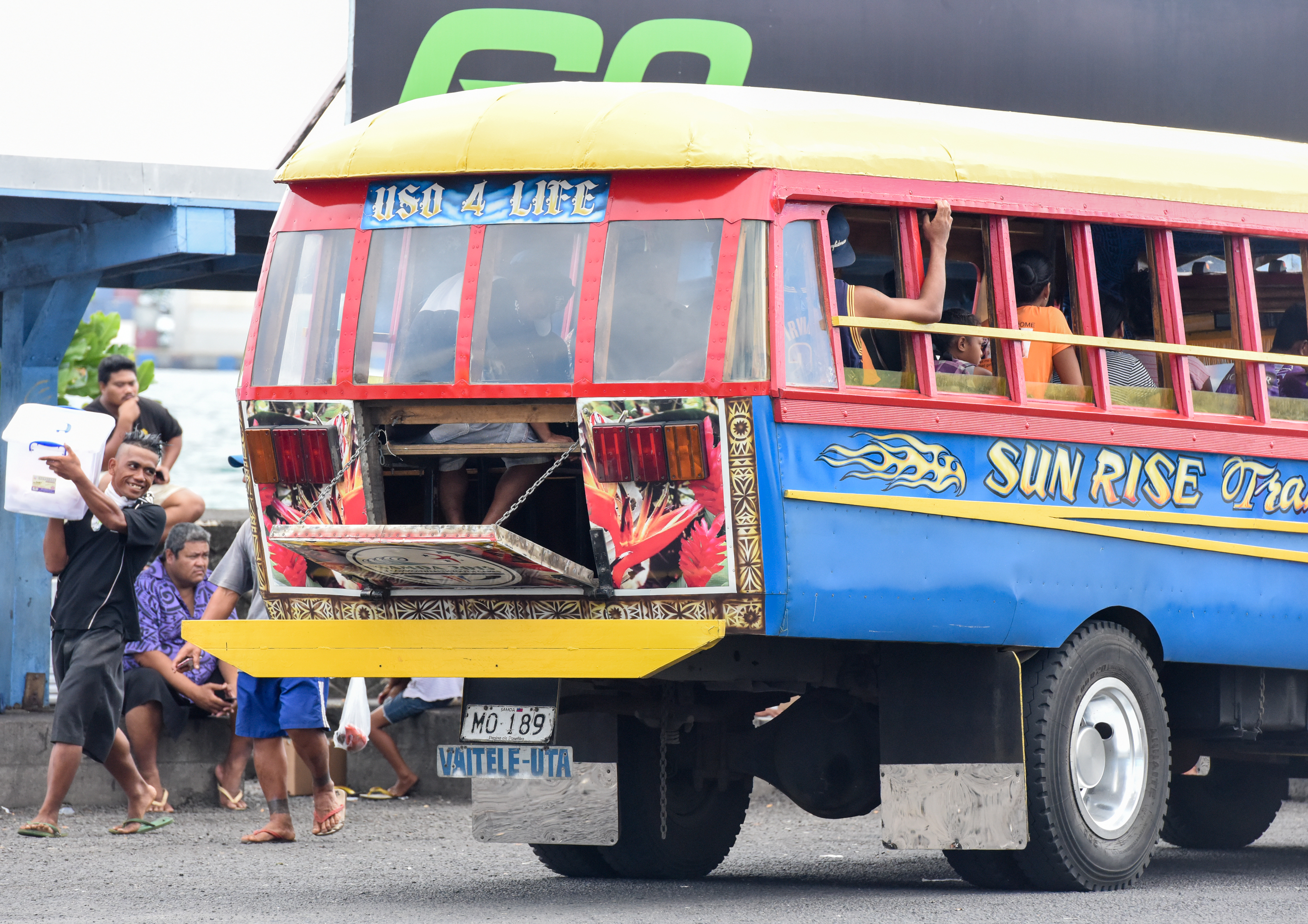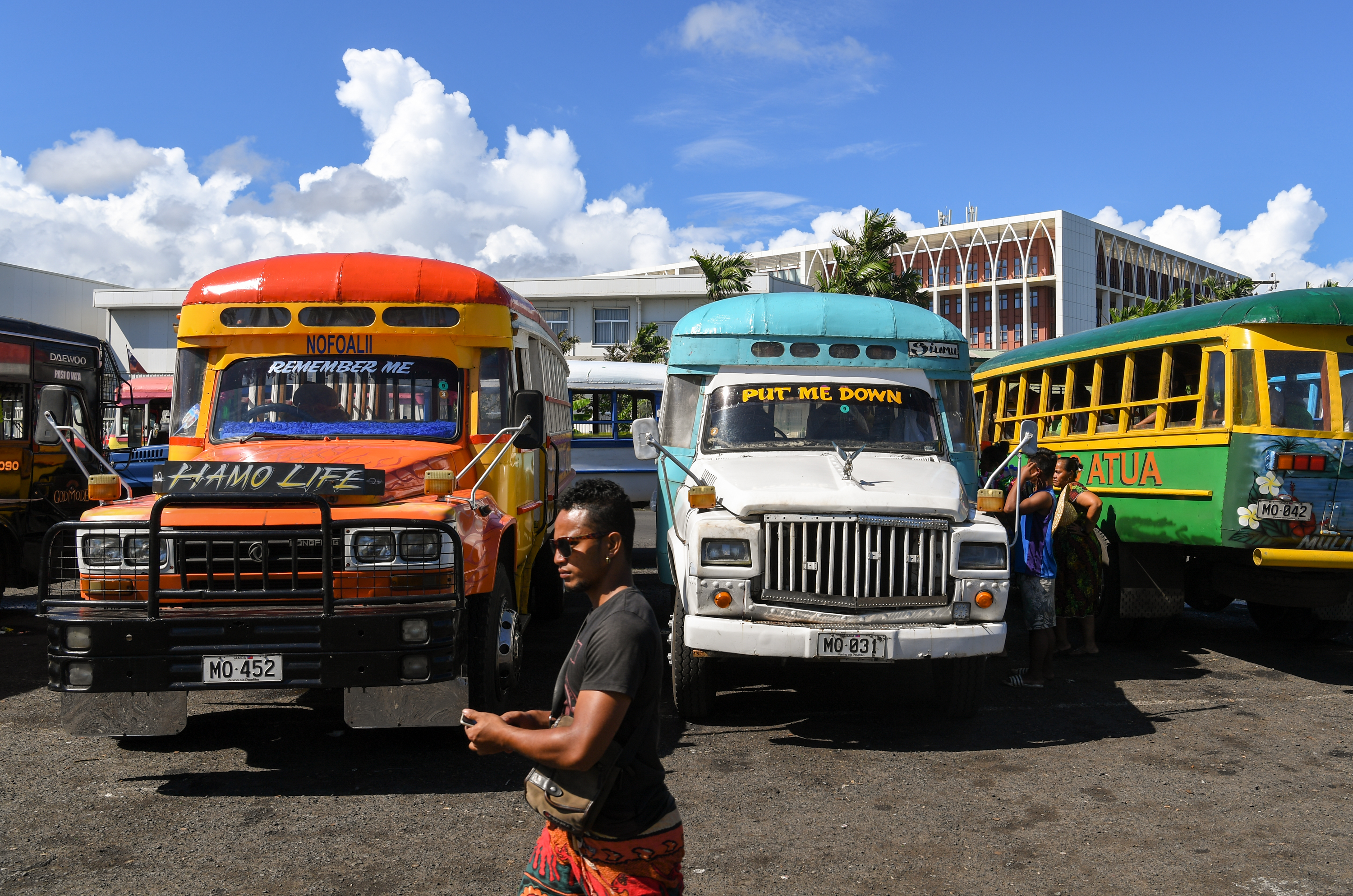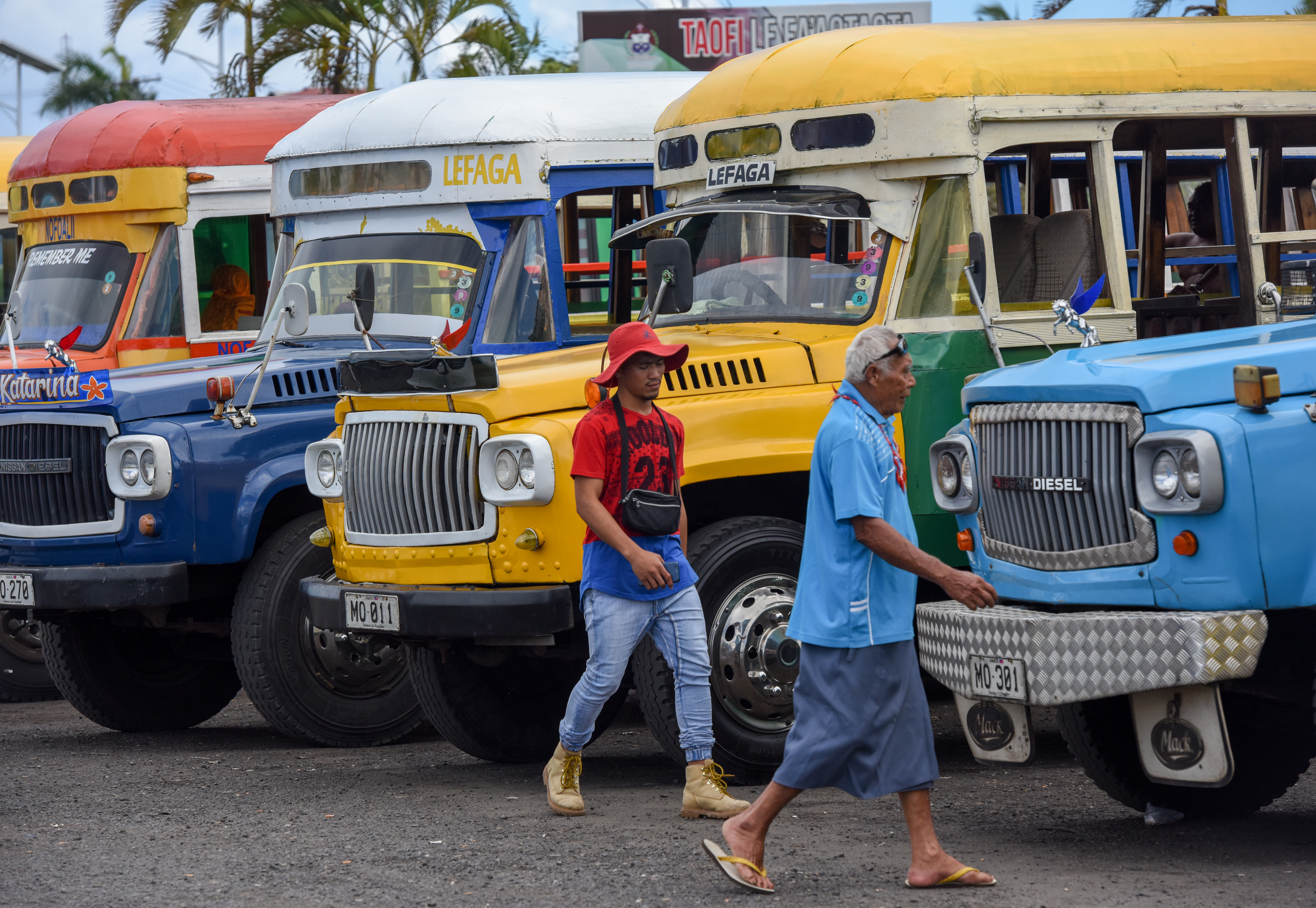 Passengers get ready for a public bus trip at the main bus station of Apia, capital of Samoa, Oct. 21, 2019.