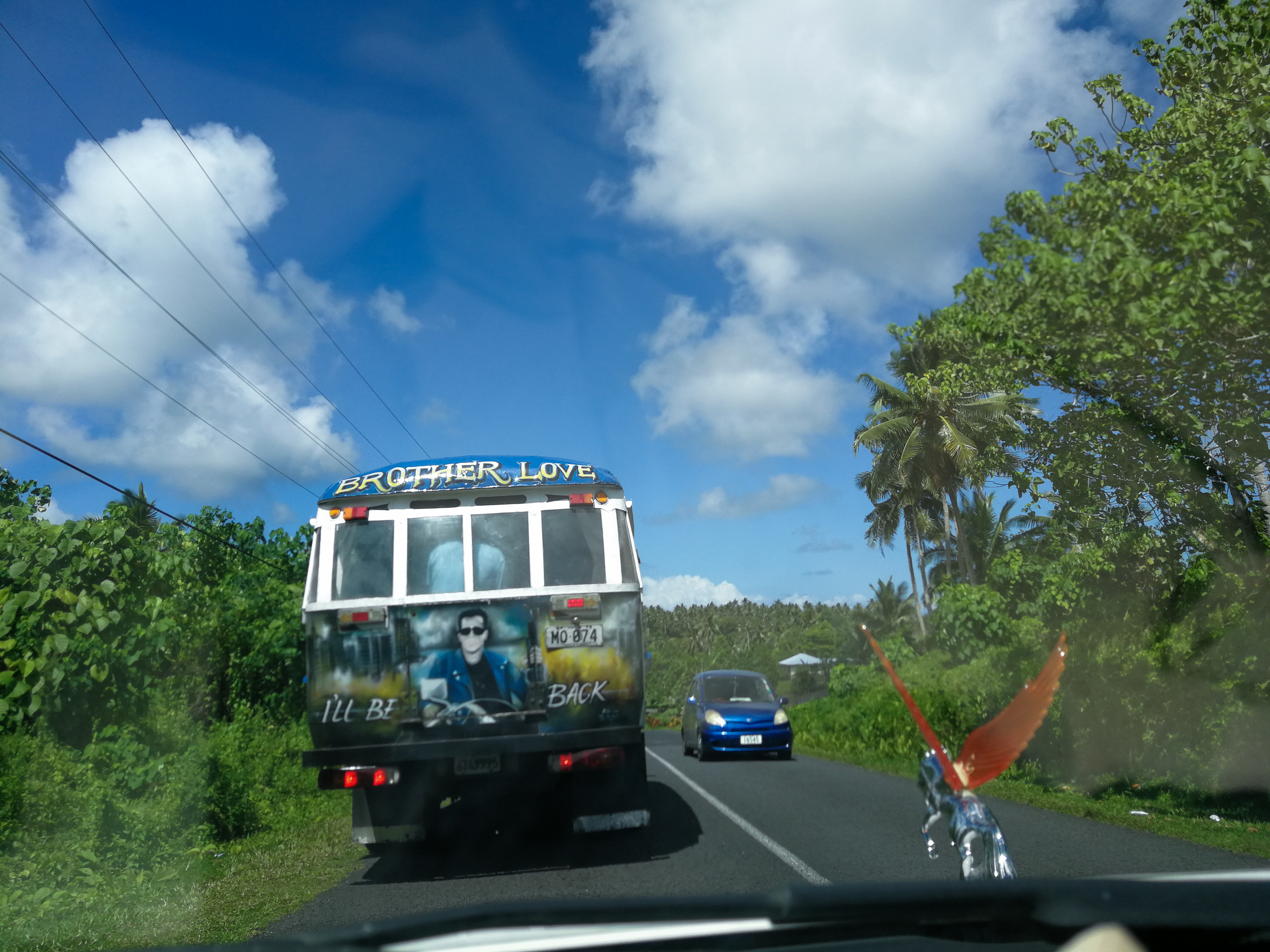 A public bus named "Brother Love" runs on a country road in Samoa, Oct. 23, 2019. (Xinhua/Guo Lei)