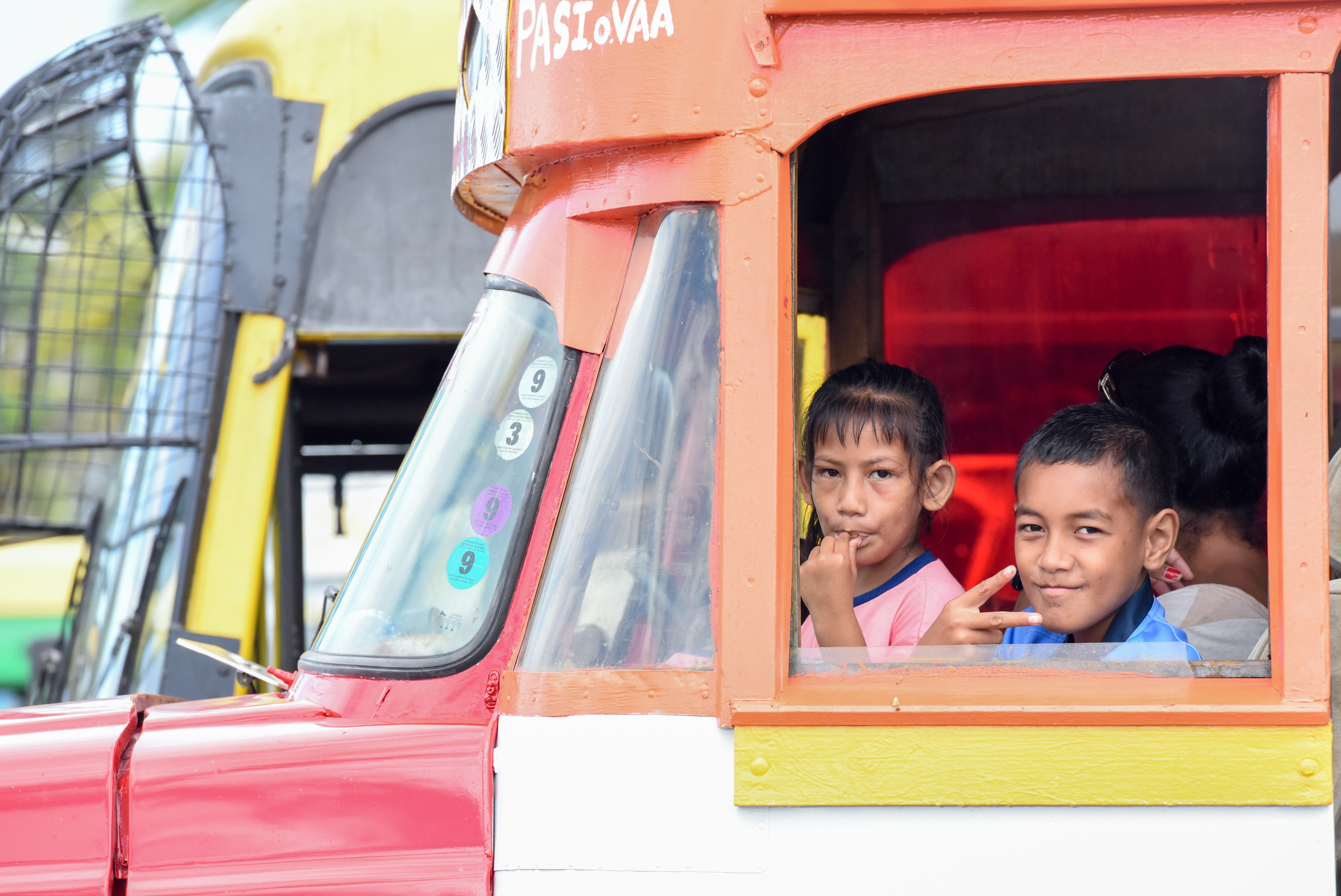 Two kids gesture from a bus at the main bus station of Apia, capital of Samoa, Oct. 21, 2019. (Xinhua/Guo Lei)