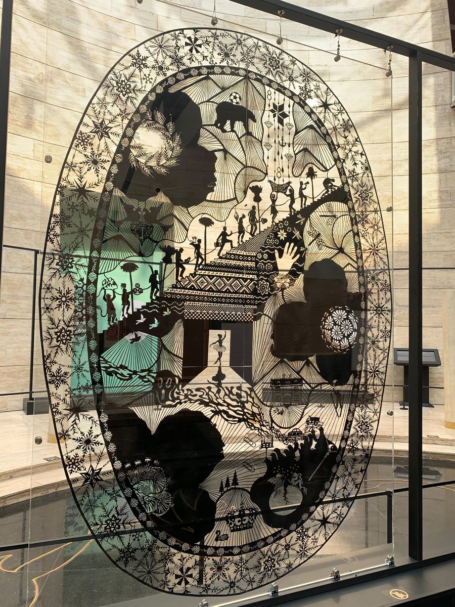 Karen Bit Vejle's paper cutting work "Egg 4 The Present" at Jinsha Site Museum, Chengdu, southwest China's Sichuan Province, Oct. 29, 2019. (Xinhua)
