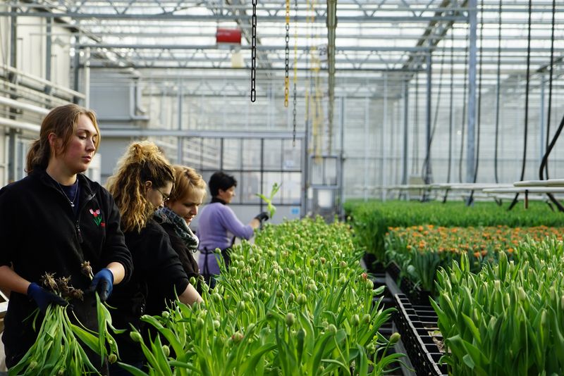 Dutch farmers harvest tulips at a greenhouse of Triflor tulip farm in the Netherlands, Nov. 4, 2019. (Xinhua/Lin Liping)