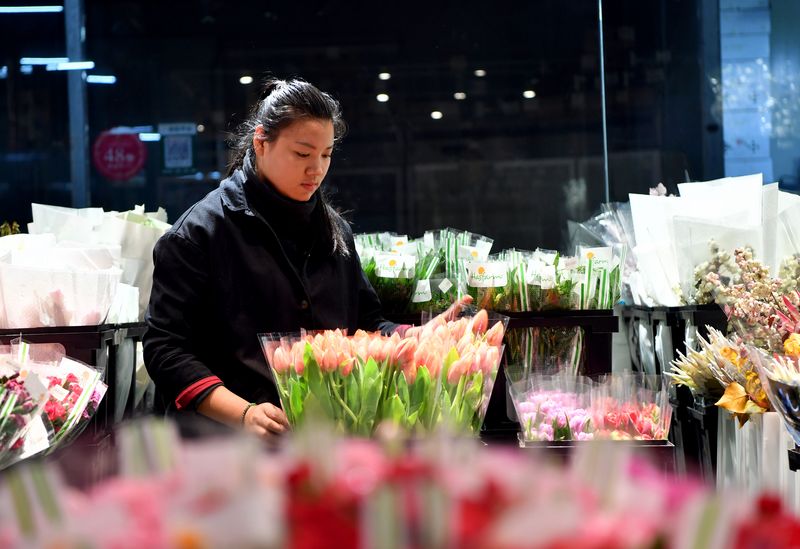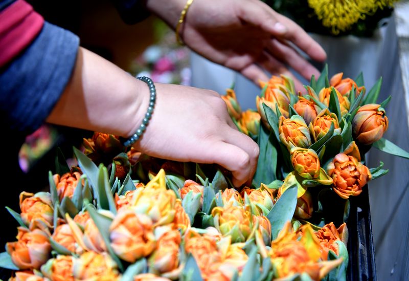 Zang Jingjing, a sales clerk at a florist's shop, arranges tulips in Zhengzhou, central China's Henan Province, Nov. 7, 2019. (Xinhua/Li Jianan)