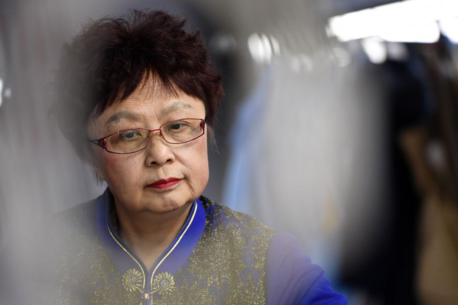 Liang Yuhua (R) measures a customer's sizes at a store of Laomeihua in north China's Tianjin, Dec. 17, 2019.(Xinhua/Li Ran)
