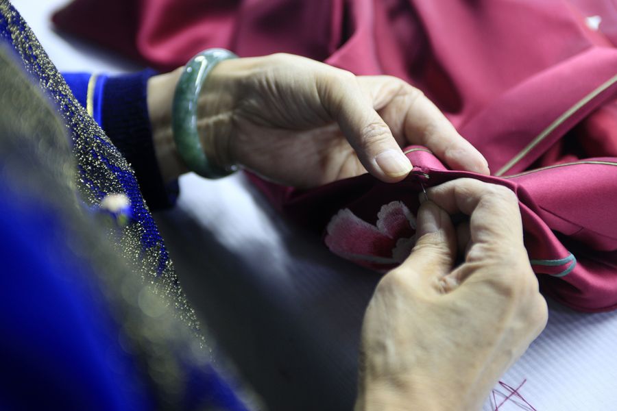 A worker performs a step of dress making at a workshop of Laomeihua in north China's Tianjin, Dec. 18, 2019. Laomeihua is a century-old store famous for its handmade shoes and clothes. (Xinhua/Zhu Weixi)