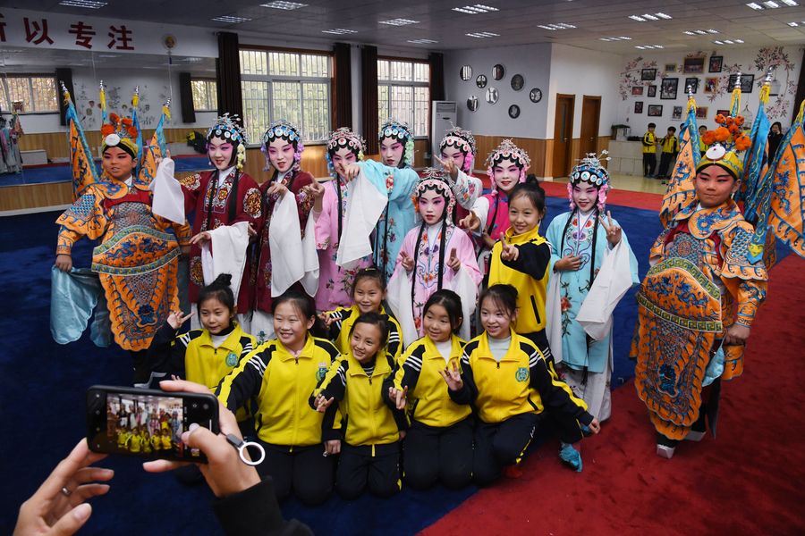Students of Peking Opera club pose for photos at Tongji Experimental School in Qingdao, east China's Shandong Province, Nov. 27, 2019. (Xinhua/Li Ziheng)