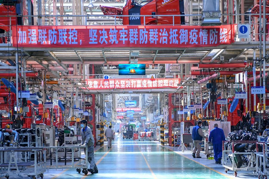 The assemble plant of FAW Jiefang truck in Changchun, northeast China's Jilin Province, Feb. 17, 2020. Companies resume production with epidemic prevention measures amid the outbreak of novel coronavirus. (Photo by Yan Linyun/Xinhua)