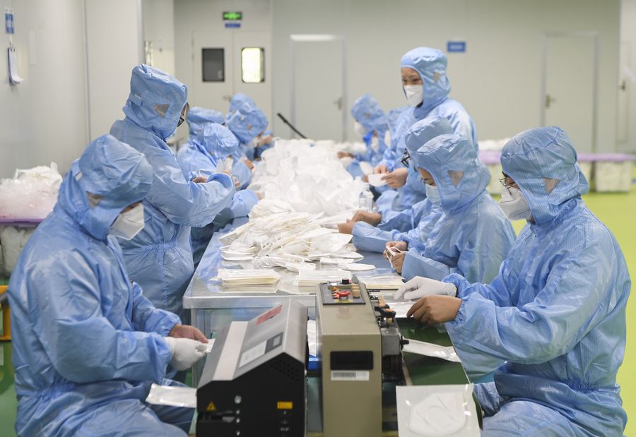 Workers produce medical N95 masks at a mask production company in southwest China's Chongqing, Feb. 17, 2020. Medical N95 masks will be supplied to the novel coronavirus epidemic prevention frontline for medical workers. (Xinhua/Wang Quanchao)