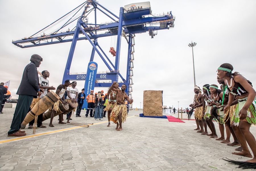 Local people perform during the inauguration ceremony of the new container terminal in Walvis Bay, Namibia, Aug. 2, 2019. (Xinhua/Zhang Yu)