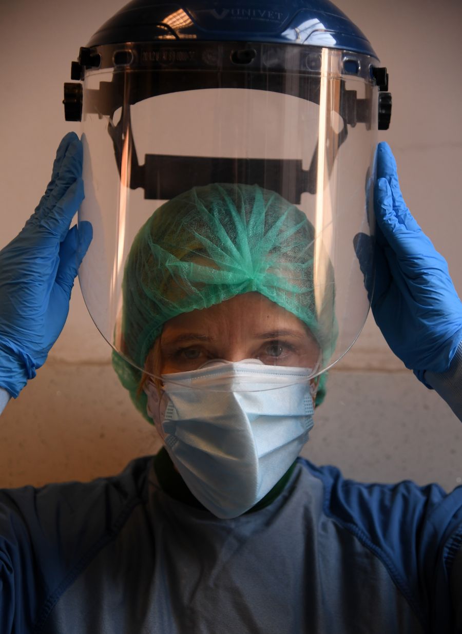 Doctor Monica Carfora puts on protective equipment before entering the COVID-19 department at Santo Spirito Hospital in Rome, Italy, April 12, 2020. (Photo by Alberto Lingria/Xinhua)