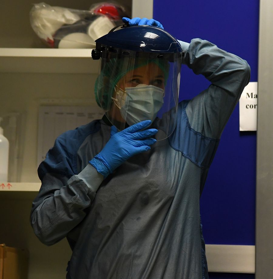 A nurse puts on protective equipment before entering the COVID-19 department at Santo Spirito Hospital in Rome, Italy, April 12, 2020. (Photo by Alberto Lingria/Xinhua)