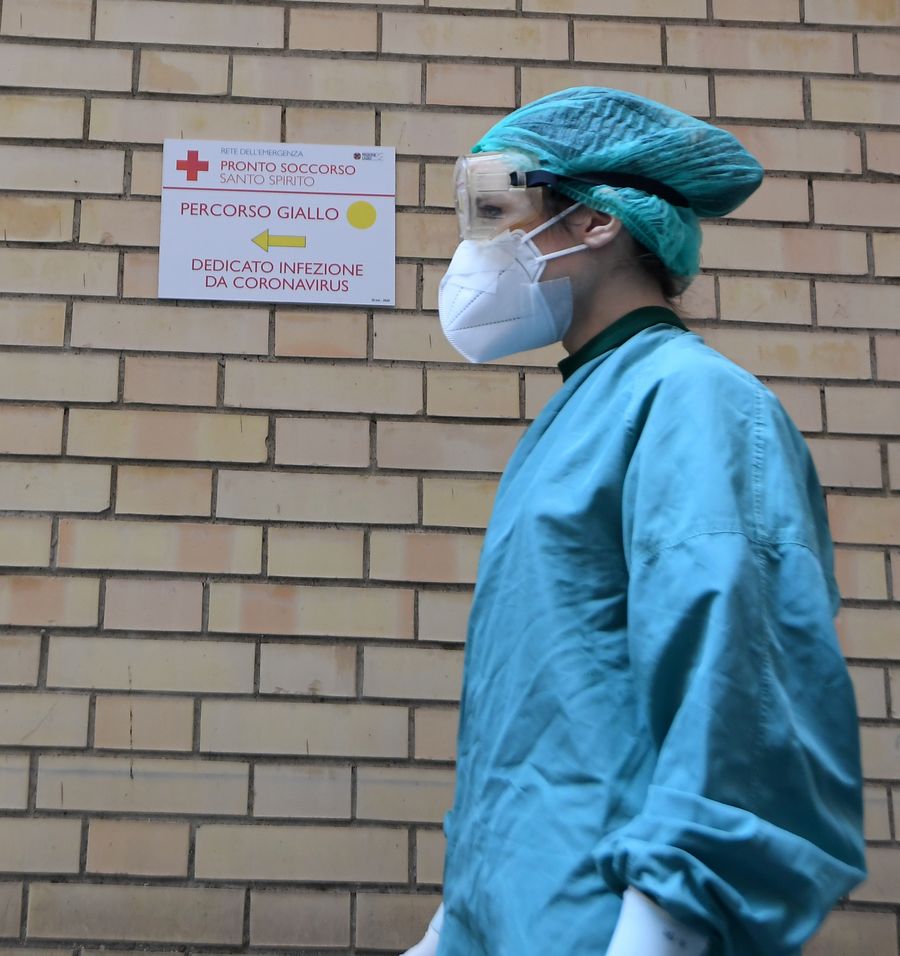 A nurse wearing protective equipment walks to the COVID-19 department at Santo Spirito Hospital in Rome, Italy, April 12, 2020. (Photo by Alberto Lingria/Xinhua)■