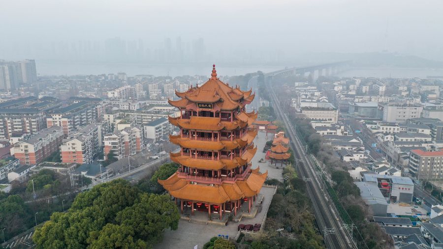 Aerial photo taken on March 14, 2020 shows the Yellow Crane Pavilion, or Huanghelou, and the Yangtze River Bridge in Wuhan, central China's Hubei Province. (Xinhua/Chen Yehua)