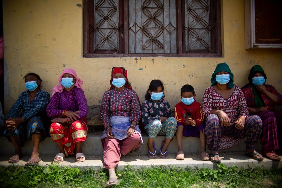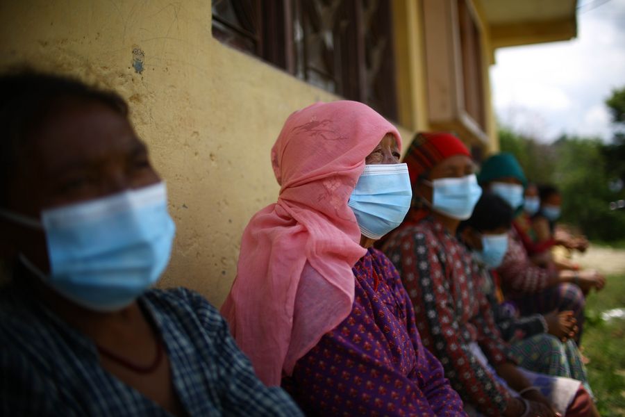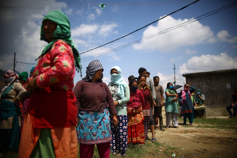 Women sit in a line, waiting for their turn to get food relief packages provided by Nepal Overseas Chinese Business Association at Bungamati in Lalitpur, Nepal, April 29, 2020. (Xinhua/Sulav Shrestha)