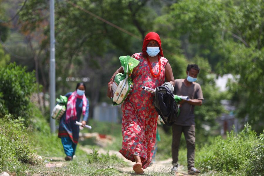 A Nepali woman carries a sack of rice, provided by Nepal Overseas Chinese Business Association, on her way home at Bungamati in Lalitpur, Nepal, April 29, 2020. (Xinhua/Sulav Shrestha) ■