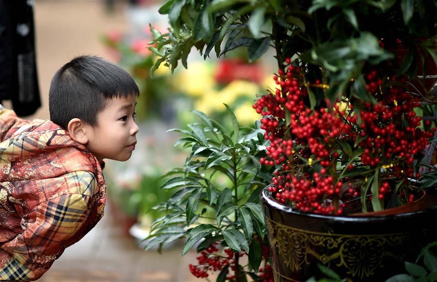 A child watches a potted plant at a flower market in Haikou, capital of south China's Hainan Province, Feb. 4, 2016. Feb. 4 marks the beginning of Spring in solar terms. (Xinhua/Guo Cheng)