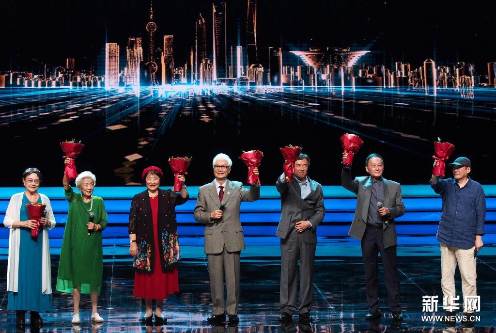 6月19日,电影艺术家王晓棠、谢芳、祝希娟、梁波罗、达式常、童自荣、郑大里(自左至右)在颁奖典礼上。新华社记者 任珑 摄