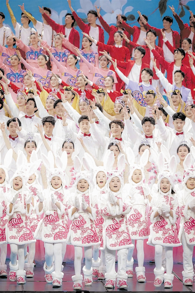 说到创新编曲,导演组介绍,其过程也是反反复复,经过前后17次修改才最终确定。由于阿卡贝拉是无伴奏合唱,每次重新编曲都要一轨一轨地先写出来,再用人声唱进去,这对编曲的速度和质量都是非常大的挑战。演唱这首歌曲的孩子们,一年前也曾在北京冬奥会开幕式上面对世界的瞩目,唱响空灵澄澈的冰雪之歌。兔年来到,这群“小雪花”降落在总台春晚的舞台。穿上暖洋洋的兔子装,他们的歌声似乎也更加温暖,随着轻快的节奏,飞向万家灯火、浩瀚星海。