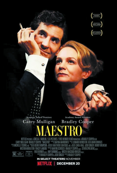 此刻,演职员的名单在缓缓上升,电影结束了。电影里的布莱德利·库珀,到底还是无法完全形似伦纳德·伯恩斯坦,但是,神似!尤其是他模仿伯恩斯坦指挥乐队时,那神态、那动作、那激情四溅的劲头,让我已经自动将演员的脸叠化成了伦纳德·伯恩斯坦。