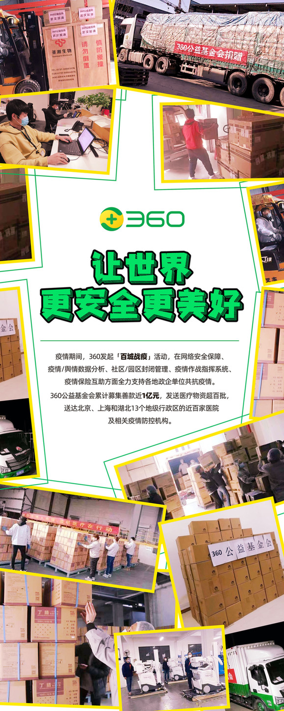 2020年初,面对突如其来的新冠疫情,360在做好自身经营工作的同时,积极履行社会责任,全力支持疫情防控工作。360和各个兄弟公司、海外合作伙伴,募集了近亿元善款,全力采购抗疫物资、设备,亲手送到了湖北13个地级行政区的近100家医院及相关疫情防控机构。捐赠物资的选择上,360在捐赠初期着眼于为疫区提供亟需物资,采购了消毒液、手套、口罩、检测试剂盒等。在行动启动一周后,利用360的科技敏感度,转入“长短结合”的捐赠策略阶段,以CT机等高科技医疗设备的捐赠为核心,以湖北各地市基层医疗机构为主要捐赠目标,短期内帮助解决基层医疗机构的“分流难、确诊难”卡点,长期则可助力基层医疗机构提升医疗硬件水平,发挥长效作用。