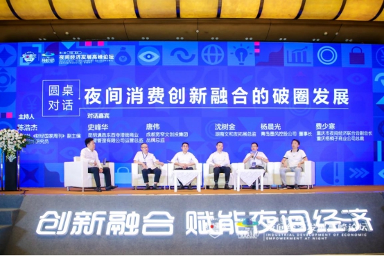 在陈浩杰的主持下,来自青岛墨风控股公司董事长杨晨光,湖南文和友拓展总监沈树金,重庆梧桐子商业公司总裁费少寒,成都宽窄文创投集团副总经理、成都文旅宽窄巷子公司副总经理马慧,昆明滇邑东西寺塔街商业运营管理有限公司董事长黄骏,围绕“夜间消费 创新融合的破圈发展”展开了圆桌对话。