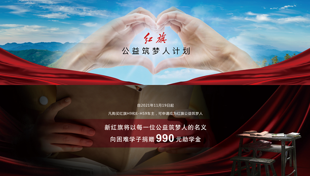 2021年中国一汽更是推出了“红旗公益筑梦人计划”, 自2021年11月19日起,凡购买红旗H9和E-HS9的车主,可申请成为“红旗公益筑梦人”;新红旗将以每一位公益筑梦人的名义,向困难学子捐赠990元助学金。