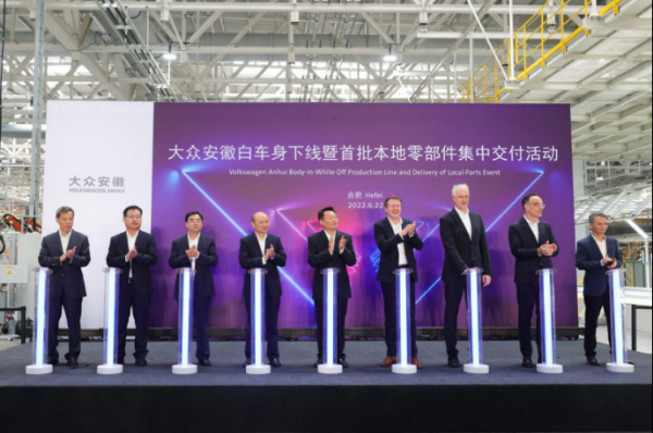 2022年6月22日,大众安徽白车身下线暨首批本地零部件集中交付活动举行。安徽省委常委、合肥市委书记虞爱华、合肥市、江汽集团、大众安徽相关领导,以及大众安徽的零部件供应商代表出席在车身车间举行的下线仪式。