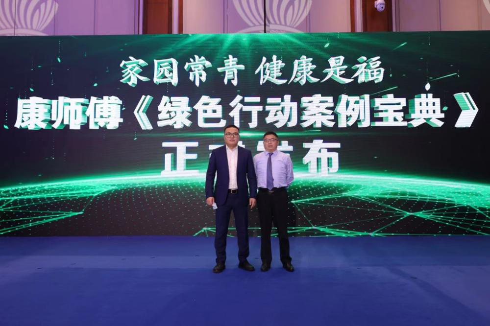 康师傅《绿色行动案例宝典》发布仪式,新华网食品事业部总经理刘洋与康师傅饮品海南行销公司总经理周俊共同参与启动仪式。