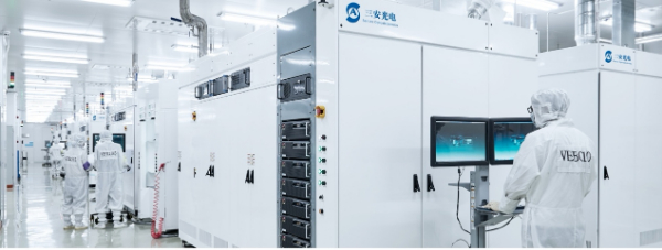 三安光电从事化合物半导体新材料、外延、芯片与器件的研发、生产和销售,拥有3000多项专利,是国家认定的博士后科研工作站及国家级企业技术中心,承担国家“863”、“973”计划等多项重大课题,曾获得国家科学技术进步奖一等奖。图为三安光电外延片生产车间。