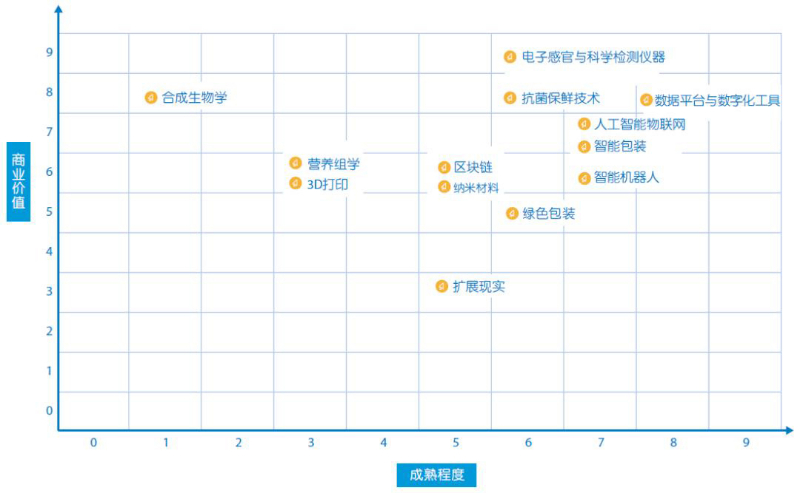 13项食品行业创新技术的成熟程度与商业价值矩阵