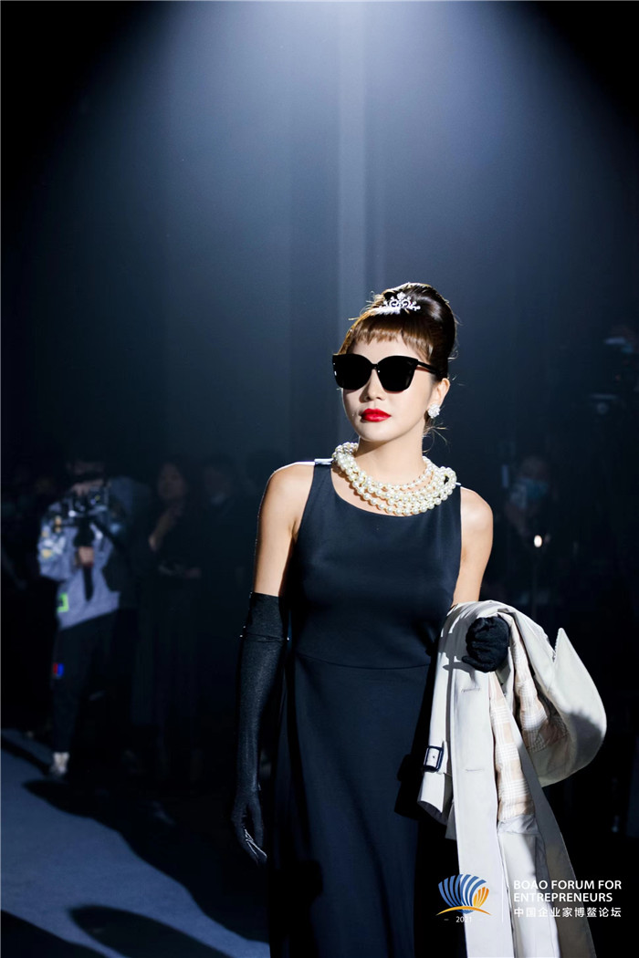 灯光渐暗、音乐渐起,在场上千位企业家菁英的目光瞬间被从大门中缓缓走出的“奥黛丽赫本”吸引,她身着英式风衣,伴着聚光灯走入会场,现场仿佛一下子穿越回1961年《蒂凡尼早餐》中那个英伦浪漫的年代。