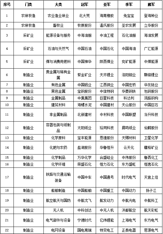 360家领军企业基础榜单以大类产业的前四名为序,产业分类顺序按照国标GB的顺序,副榜单以所有企业的综合值排名为序。
