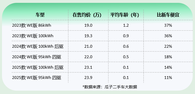 供给的充足,让二手极氪001的价格也变得极具吸引力。以2023款WE版86kWh和100kWh车型为例,它们的价格都比新车便宜了30%以上。即便是今年新推出的2024款和2025款WE版后驱车型,价格分别比新车便宜了22%和14%。此外,经过几次换代,极氪001的二手车价格也已经基本稳定。