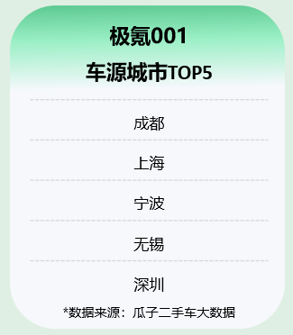 根据瓜子大数据显示,成都的二手极氪001车源占比最高,其次分别为上海、宁波、无锡、深圳。在这些城市中,用户将更容易找到心仪的选择。