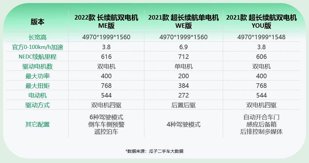 极氪001目前共有20余款车型,主要以WE、ME、YOU三个版本为主,这些版本在动力、续航和配置上存在差异。为了给消费者提供合理的参考,瓜子二手车选取了以下三个具有代表性的车型进行分析。