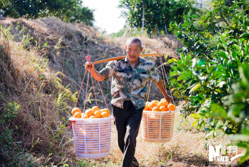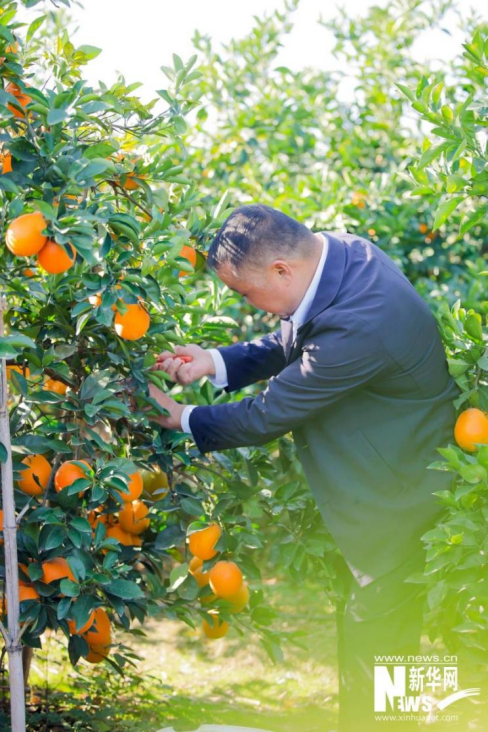 果农叶荣发在自家的脐橙果园里走走停停,察看脐橙生长情况。“今年天气好,雨水足,脐橙长势好,个大皮薄,汁多味甜,多亏了政府的支持和科学种植技术的推广。” 老叶边说边小心翼翼地剪下一个个成熟的脐橙,脸上洋溢着难以掩饰的喜悦。